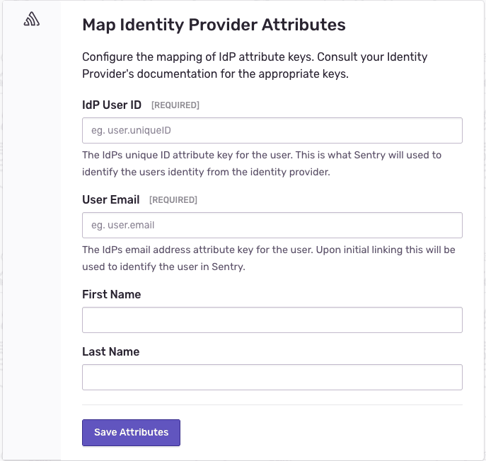Here, the field values of Sentry members need to be matched up with the corresponding values for members in the IdP. The basic required fields are the IdP's User ID and email address, but Sentry can also optionally pull first and last name values from there as well.